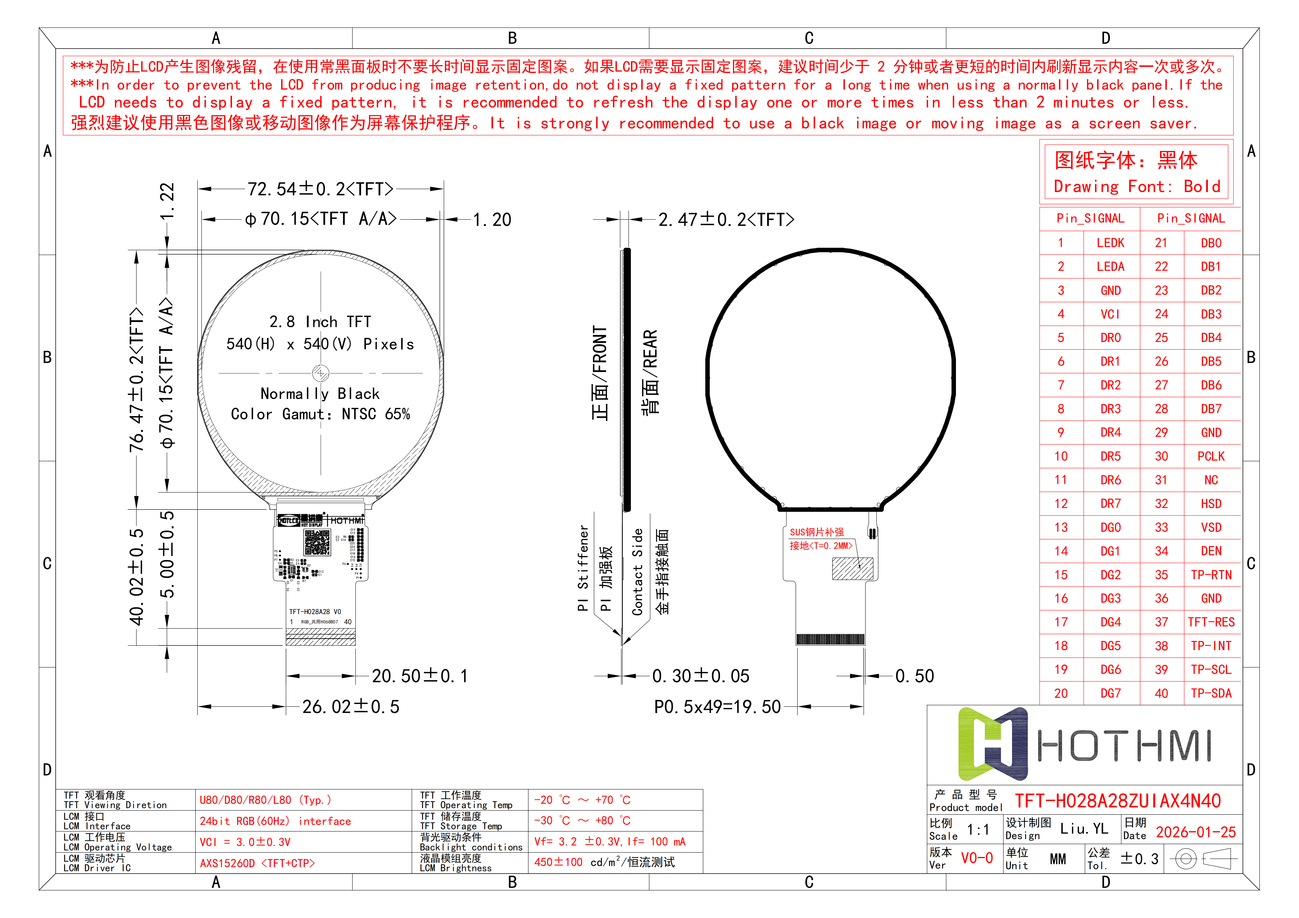 72.54x76.47 | 2.8 | 2.8 | 70.15x70.15 | IPS | 450cd/m2 | FPC-40PIN | RGB | Anti-static ESD 8KV | -20~70℃ | 3.3V | AXS15260D | |